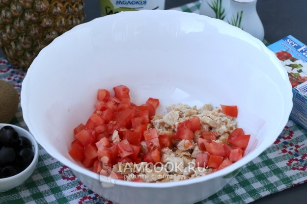 Ананас разрезать, вынуть мякоть, удалив грубую центральную часть. Нарезать ананас кубиками. Почистить киви и также нарезать кубиком.