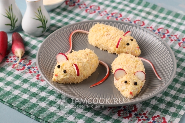 В отдельную тарелку натереть твёрдый сыр на мелкой тёрке. Из сырной массы сформировать овалы, туловища мышек, обвалять каждую в сырной стружке.