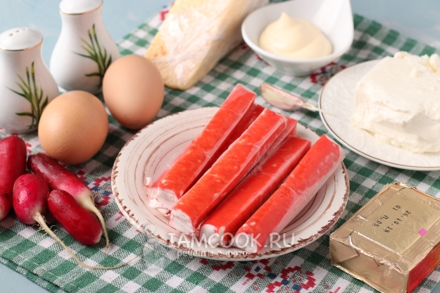 Для приготовления закуски «Мышки» из сыра и крабовых палочек подготовить из списка необходимые ингредиенты. Яйца сразу поставить варить.