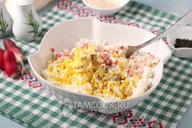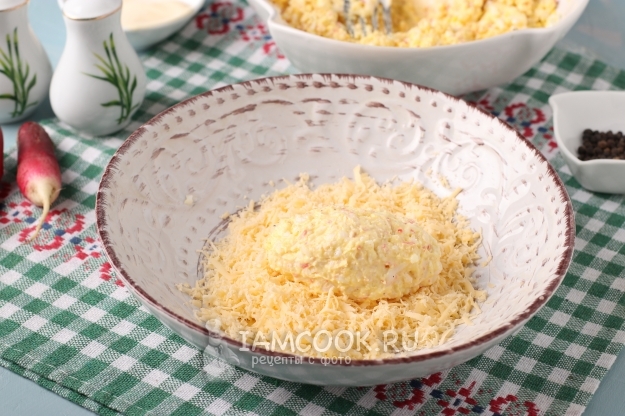 Варёные яйца остудить, почистить и натереть на тёрке. В тарелку с сыром добавить крабовые палочки, чеснок и яйца, поперчить. Если потребуется - добавить майонез, буквально 1 ч.л. Соль в данной закуске может не понадобиться, всё зависит от сыра, который вы будете использовать. Я соль вообще не добавляла.