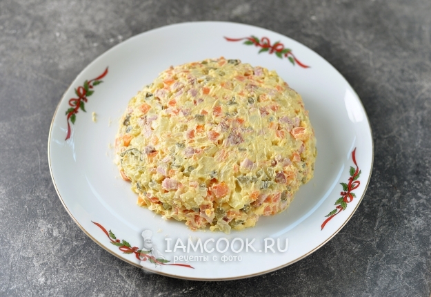 Присыпьте всю поверхность салата натертым белком, имитируя снег. Тарелку протрите чистой салфеткой от остатков салата.