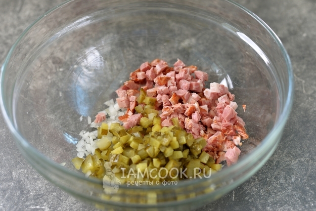 Пока овощи и яйца варятся, нарежьте очень мелко белый салатный лук, копченое мясо и маринованный огурец, сложите все в глубокую миску.