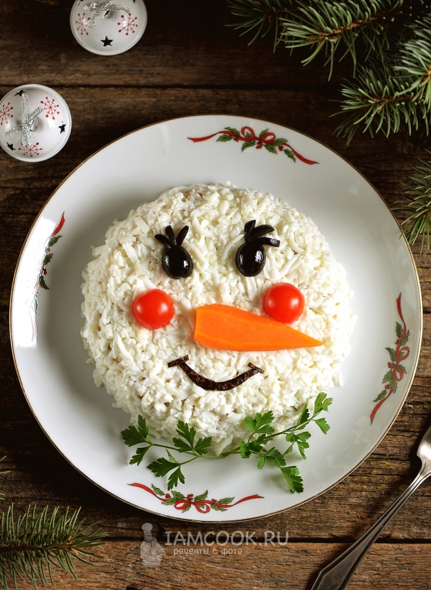 Готовый салат "Снеговик" подавайте на праздничный стол в качестве холодной закуски. Приятного.