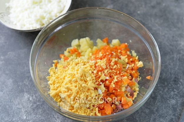 Добавьте нарезанный мелким кубиком картофель и морковь, не забудьте из ломтика одной морковки вырезать носик. Отделите белки от желтков, белки натрите на терке, сложите в отдельную миску, натертые желтки переложите в салат.