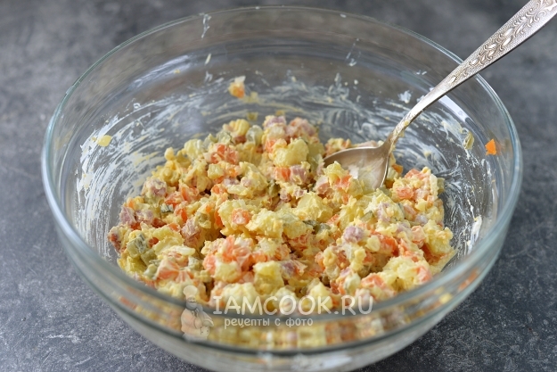 Салат посолите и поперчите по своему вкусу, заправьте майонезом, перемешайте.