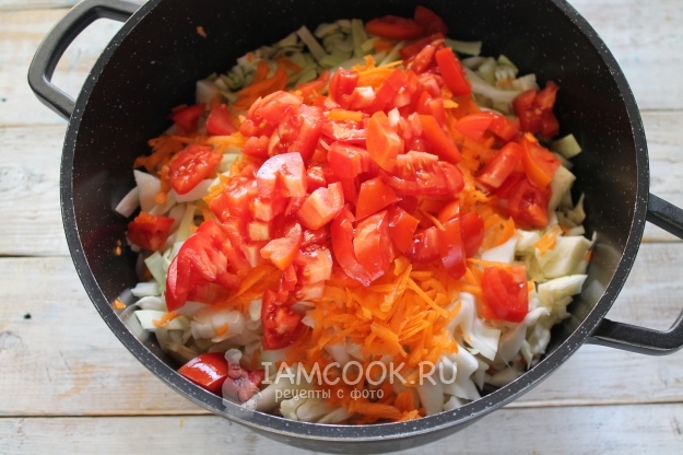 Следом отправьте в казан нарезанные мелким кубиком помидоры. Влейте подсолнечное масло и тушите полчаса на среднем огне, помешивая периодически деревянной ложкой. Затем солянку посолите, добавьте по вкусу сахар, бросьте лаврушку и перец горошком и тушите еще под крышкой минут 15-20.