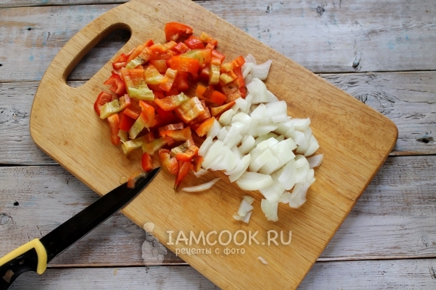 Квадратиками или прямоугольниками более крупного размера нарежьте сладкий перец, хорошо, если он у вас яркого цвета, солянка получится красивее. Лук нарежьте средним кубиком.