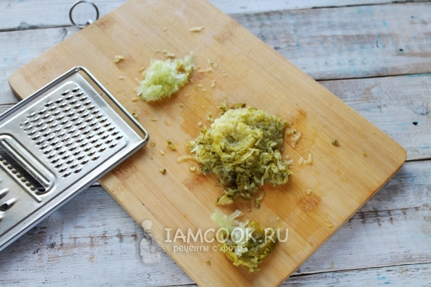 Теперь нужно все продукты измельчить. Можно мелко нарубить острым ножом, а чтобы соус был нежнее, можно прибегнуть к помощи терки. Натрите на среднего размера решетке стебель сельдерея, корнишоны. Оставшуюся кожицу уберите.