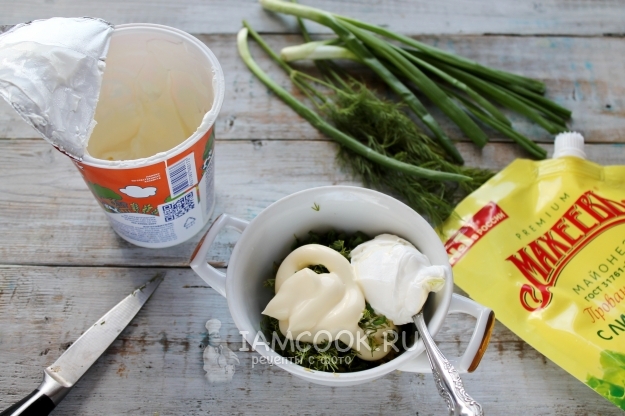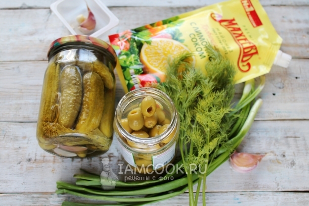Возьмите продукты для приготовления соуса Тартар с оливками и огурцами.