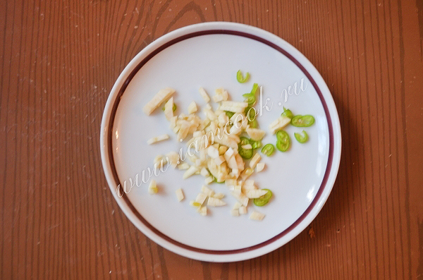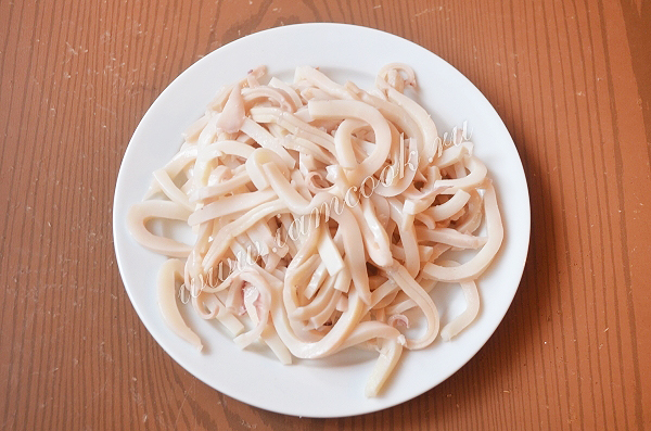 Кальмаров почистить, хорошо промыть и просушить. Нарезать тонкими полосками.