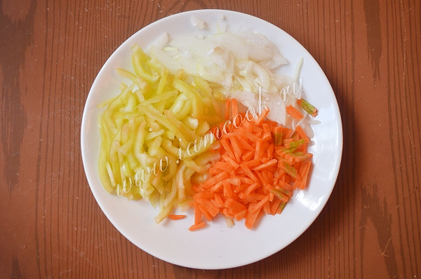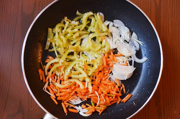 Кальмаров выложить в тарелку, в этой же сковороде обжарить на среднем огне лук, морковь и сладкий перец в течение 5 минут.
