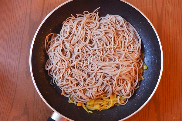 К овощам добавить готовую собу, перемешать, обжаривать 2-3 минуты.