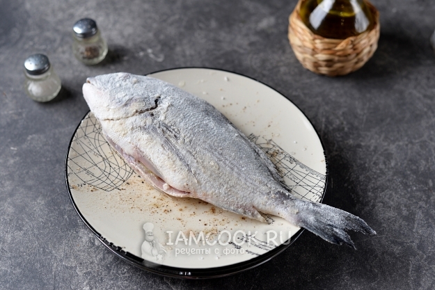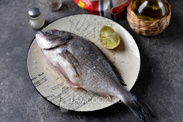 Рыбу почистите от чешуи, внутренностей и не забудьте удалить жабры, помойте хорошенько под проточной водой. Посолите и поперчите тушку снаружи и внутри, полейте лимонным соком, оставьте мариноваться минут на 10.