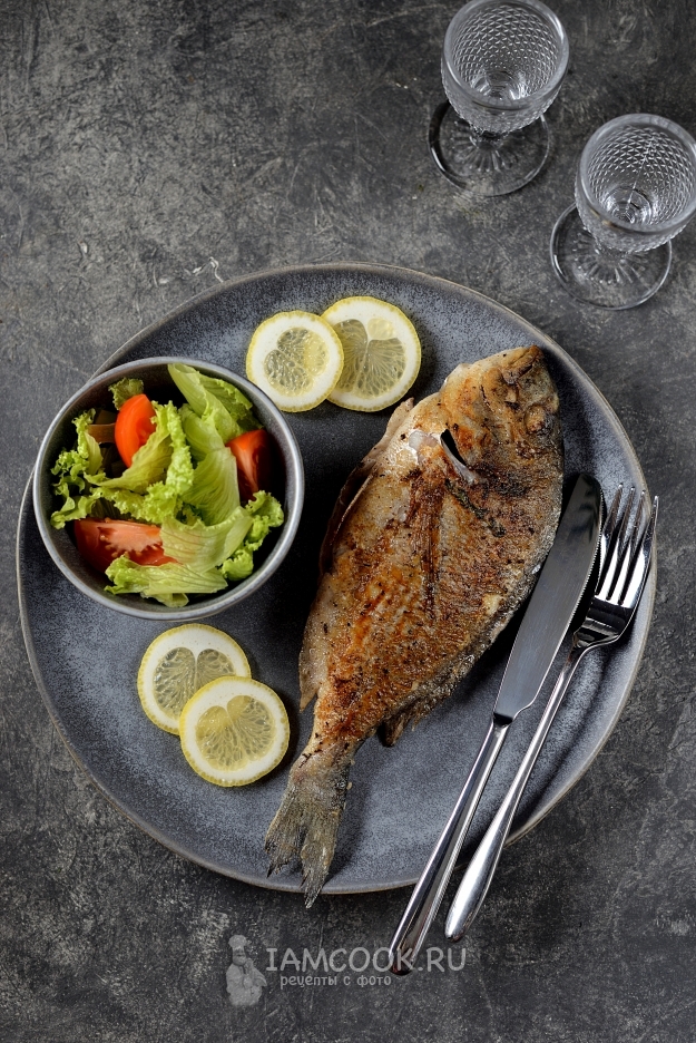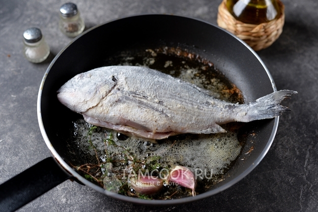 Эту вкусную и жирную рыбку почему-то принято чаще всего запекать. Я же увидела очень интересный способ приготовления жареной дорадо на сковороде с чесноком, тимьяном и с добавлением сливочного масла. Честно говоря, даже представить себе не могла, что это настолько вкусно. Попробуйте при случае именно так пожарить дорадо, и очень даже может быть, что этот способ станет вашим любимым.