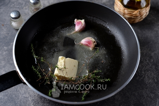 Разогрейте в сковороде постное рафинированное масло, добавьте кусок сливочного, положите веточки тимьяна и раздавленные тыльной стороной ножа зубчики чеснока.