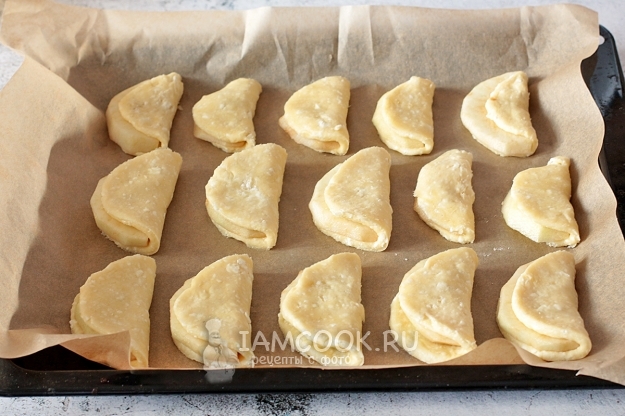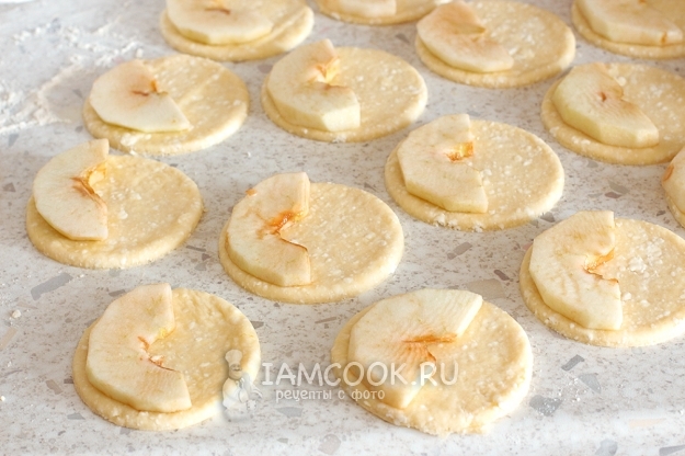 Тесто раскатайте на столе, посыпанном мукой, и вырежьте кружочки по размеру ваших яблочных долек. Разложите кусочки яблок на кружочки теста, как показано на фото. Заверните свободную сторону теста на яблоки в форме вареника. Если тесто прилипает, то помогайте себе ножом отделять тесто от стола. Оно и должно быть очень-очень мягким.