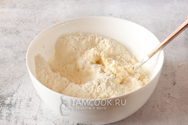 Затем добавьте просеянную муку и замесите тесто. Оно получается рассыпчатыми крошками, не забивайте его мукой, а просто соедините в мягкий комочек.