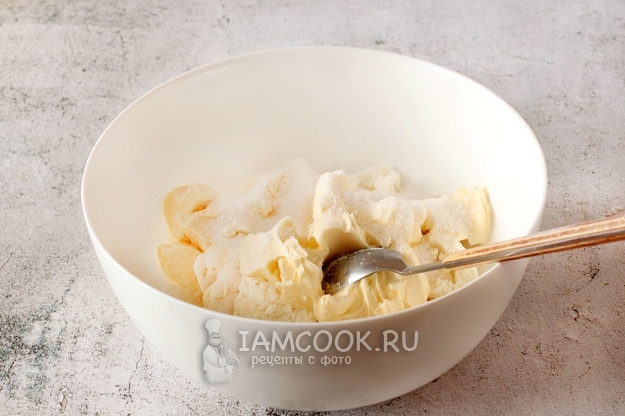 Творог соедините с размягченным маслом, добавьте сахар, щепотку соли и ванилин. Хорошенько разотрите до однородности. У меня был хорошо отжатый творог и я растирала его вручную, поэтому остались кусочки творога. Но можно пробить все погружным блендером, чтобы структура смеси стала однородной, как крем.
