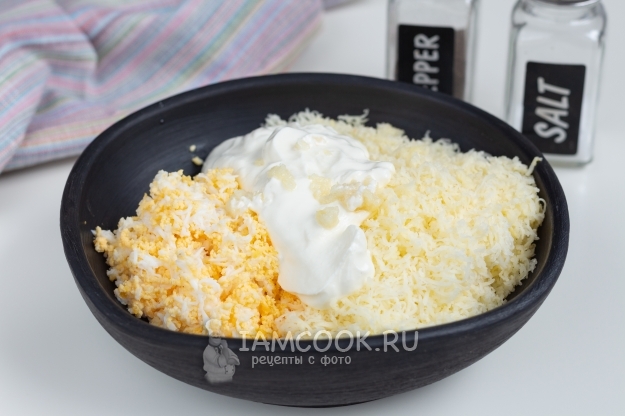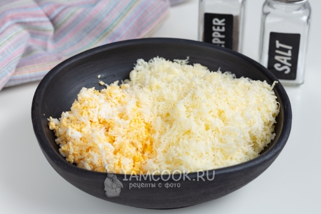 Отвариваем яйца вкрутую и, очистив, трем их на мелкой терке. Сыр также трём на мелкой сырной тёрке. Соединяем яйца и сыр в одной глубокой тарелке.