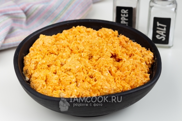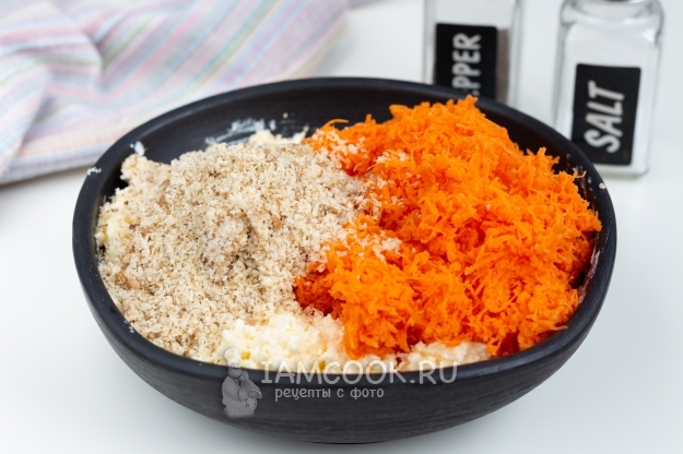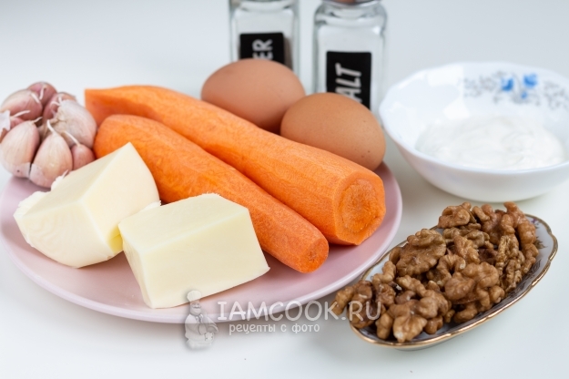 Трём на мелкой тёрке сырую морковь. Измельчаем грецкие орехи удобным вам способом (тёркой, измельчителем, ножом). Добавляем морковь и орехи к сырной смеси.