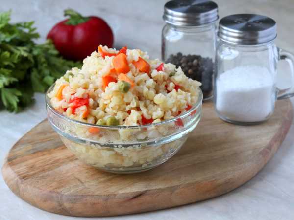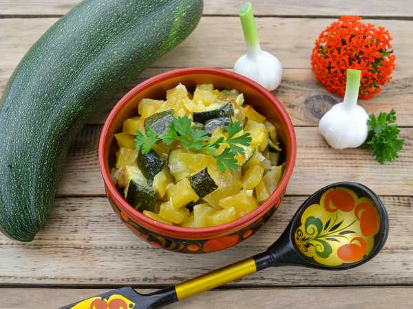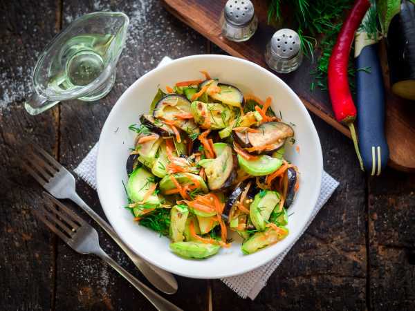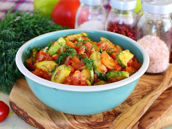 Добавьте нарезанные таким же мелким кубиком кабачок, болгарский перец и баклажан. Как только баклажан впитает все масло, влейте немного воды, накройте сковороду крышкой, сделайте тише огонь, тушите рагу 10-15 минут.