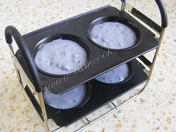 Формочки смазать маслом и присыпать манкой. Вообще, я обычно еще подстилаю бумажные стаканчики, промазанные маслом. Это удобнее, так как после выпечки такие кексы можно сразу достать из формы и налить следующую порцию теста. Если же не подстелить, как я сделала в этот раз, то прийдется ждать, пока подносики остынут, чтоб извлечь изделие.