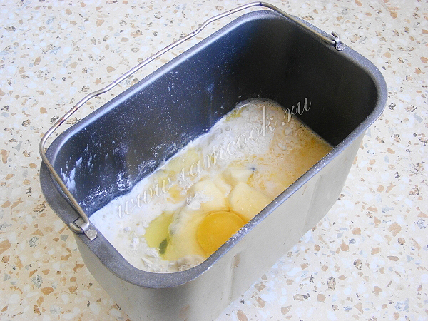 В форму для хлебопечки влить молоко, растопленное сливочное масло (я его топлю в микроволновке 40 секунд), вбить яйца, всыпать муку с разрыхлителем, добавить соль, сахар.