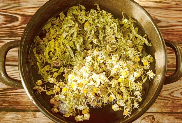 Ромашку и мяту засыпаем в кастрюлю с водой. Ставим на огонь — пусть нагревается.