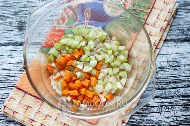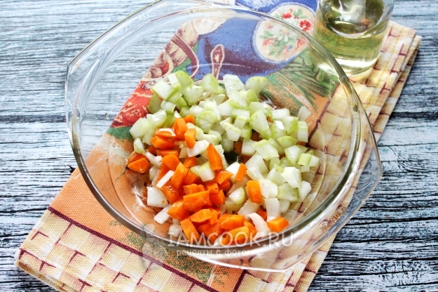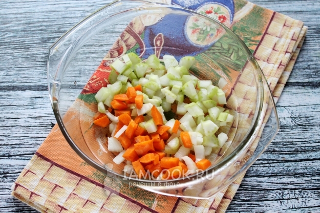Сложите нарезанные овощи в кастрюлю для микроволновки.