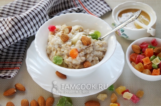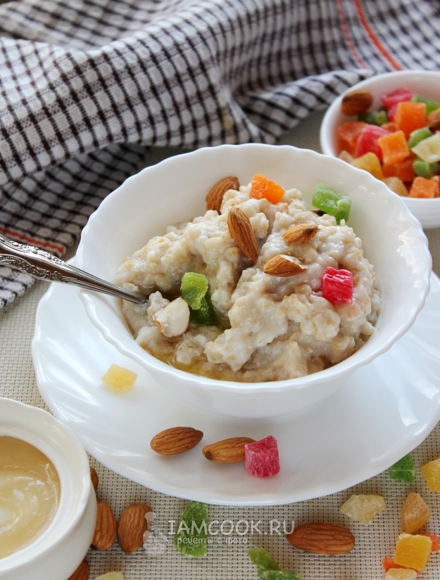 Подавать вязкую овсянку на молоке можно с фруктами и ягодами, орехами и цукатами - как вам нравится.