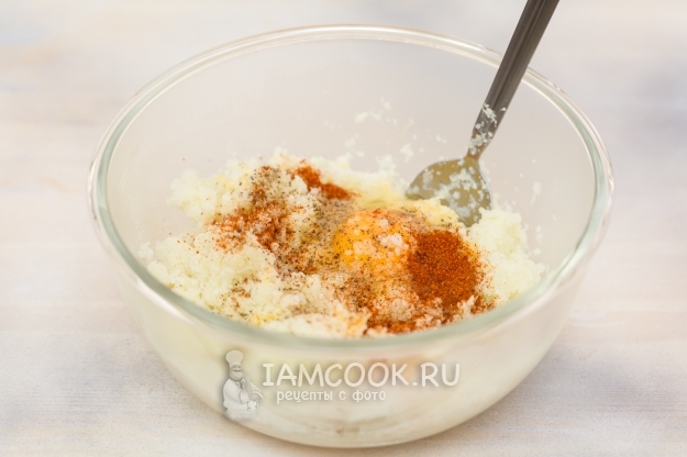 Выложите капусту в миску. Туда же отправьте натертый на мелкой терке сыр, измельченный чеснок, яйцо, перец и соль, паприку.
