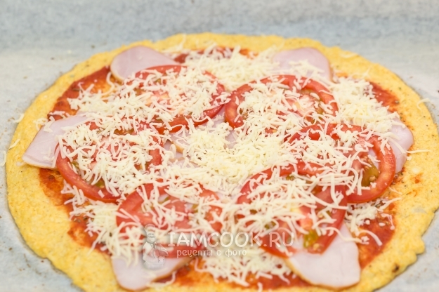 Поверх томатного соуса выложите большую часть натертой на мелкой терке моцареллы. На сыр - нарезанную тонко ветчину. Поверх нее - нарезанный тонко помидор. И присыпьте оставшейся частью натертой моцареллы.