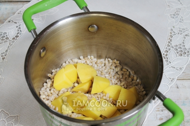 Перловую крупу сварите заранее или поставьте вариться предварительно, а когда она сварится, приступайте к закладке остальных ингредиентов рассольника.