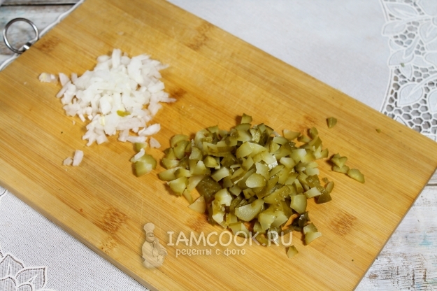 Тем временем мелко нашинкуйте лук и огурцы. Можно воспользоваться крупной теркой.