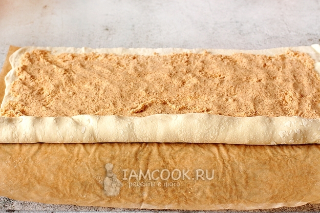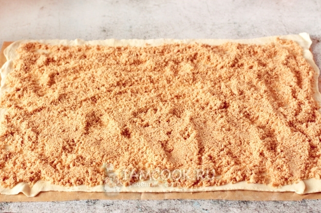 Слоеное тесто разделите на 2 части, как и начинку. Раскатайте тесто тонким слоем и выложите половину крошки. Ах, как же она пахнет и такая вкусная...). Придавите крошку к тесту ладонями или прокатайте скалкой.
