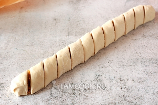 Нарежьте рулет наискосок, кусочками по 1.5-2 см.