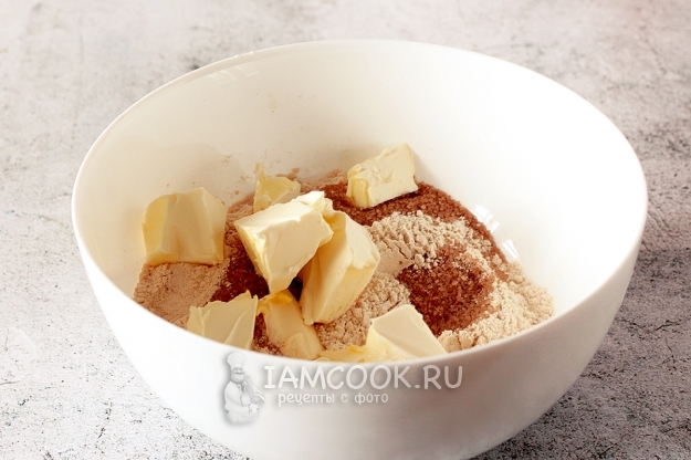 К остывшей муке добавьте кусочки сливочного масла и коричневый сахар. Сюда же можно добавлять и ванилин, и корицу, если вы, конечно, любите эти добавки. Я добавила щепотку ванилина, но и без него смесь получилась очень ароматной. Хорошенько перетрите сыпучую смесь до однородной пластичной крошки. Если крошку сжать в ладони, она не должна рассыпаться.