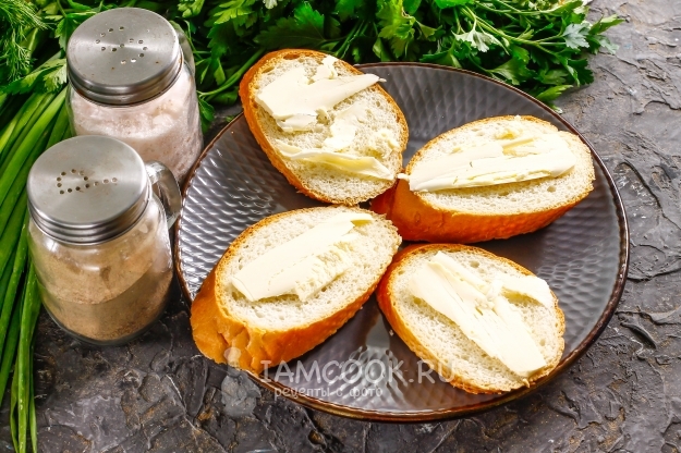 Нарежьте багет ломтиками, выложите на него кусочки сливочного масла и размажьте их.