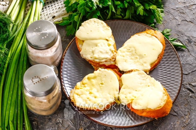 Если используете микроволновку, то выложите заготовки на тарелку без золотистых или серебристых рисунков - только такие можно помещать в эту технику. Запеките примерно 1-2 минуты на самой высокой мощности микроволновки. Если используете духовку, то заранее прогрейте ее до 150-180 градусов, выложите заготовки на противень и запеките около 5-8 минут, до расплавления сыра.
