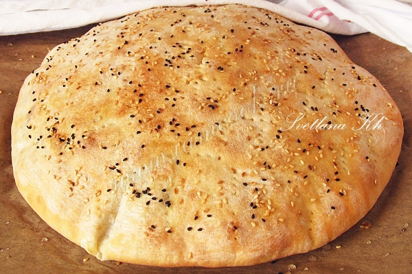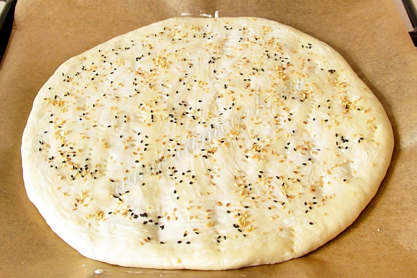 Разровнять, перевернуть и раскатать скалкой до ровного и плоского круга. У меня пирог получился в диаметре более 30 см. Верх наколоть вилкой, не затрагивая дно, смазать сливками или яйцом, посыпать кунжутом и чернушкой (нигеллой). Поставить выпекать при 180 градусах на 30 минут. В газовой духовке температура будет выше- 200 -220 грамм.