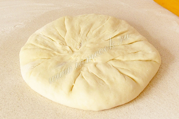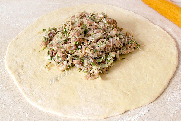 Тесто раскатать на столе одной большой лепешкой. Толщина теста не менее 8 мм. Выложить в центр всю начинку.