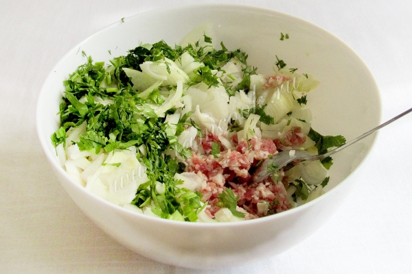 Остальной лук порезать тонкой соломкой, зелень измельчить и добавить в фарш. Посолить и поперчить по вкусу. Добавить сливки или молоко для сочности фарша. Чем больше лука в начинке, тем пирог получится сочнее. Только лук нарезать нужно очень тонко.