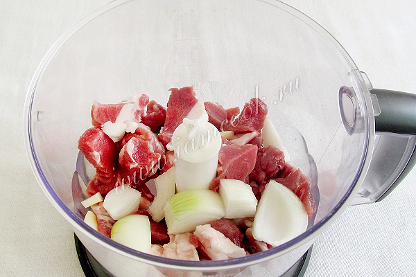 Готовим начинку. Мясо измельчить в процессоре или прокрутить в мясорубке вместе с зубчиком чеснока и половинкой лука.