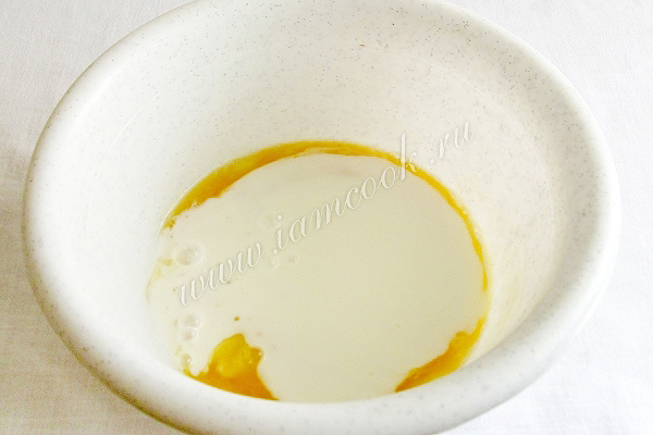 Готовим тесто. Яйцо слегка разболтать с солью. Добавить кефир, соду, растительное масло и хорошо размешать.
