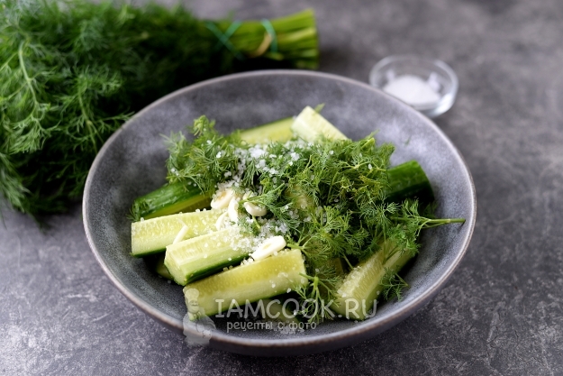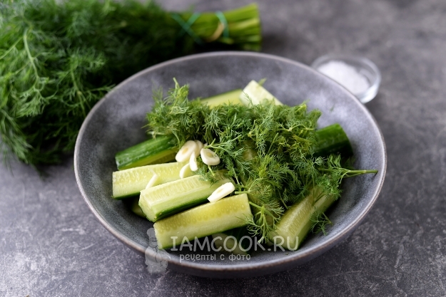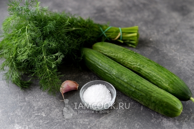 Подготовьте все необходимые продукты приготовления ленивых соленых огурцов. Огурцы, укроп и очищенный чеснок помойте под проточной водой, обсушите.