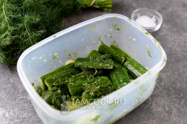Переложите заготовку в контейнер, накройте крышкой и слегка встряхните около минуты. Только без пристрастий, иначе мягкая и нежная часть с прозрачной сочной семечкой сотрется полностью)). Оставьте огурцы ровно на 5 минут досолиться.