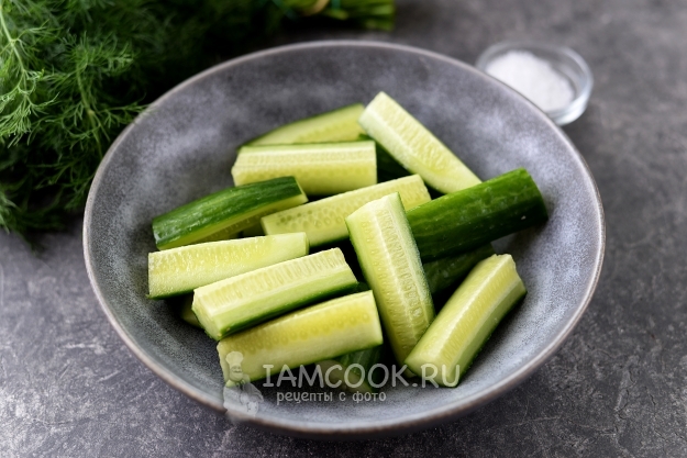 Огурцы нарежьте четвертинками длиной 5-6 сантиметров. Сложите в удобную глубокую миску.