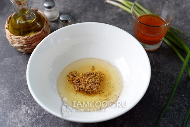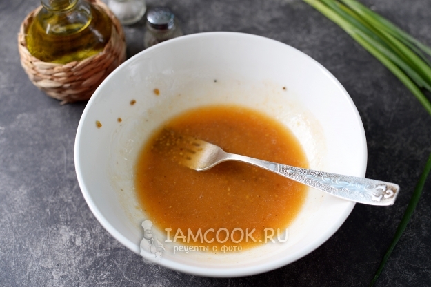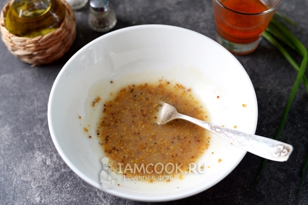 В глубокой миске смешайте оливковое масло, уксус и горчицу, чуть посолите и поперчите, по желанию добавьте щепоть сахара.