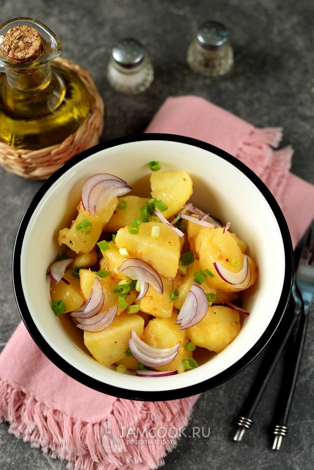 У этого картофельного салата достаточно много названий - австрийский, венский, немецкий и даже чешский, поскольку давно стал блюдом европейской кухни. Подается салат в качестве холодной закуски или гарнира. Иногда включает в себя добавки в виде бекона и соленых огурцов. Мы сегодня приготовим самый простой рецепт - без мяса.