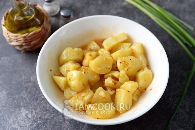 Картофель еще теплым нарежьте на крупные ломти, сложите в заправку, перемешайте и оставьте мариноваться минут на 10-15.